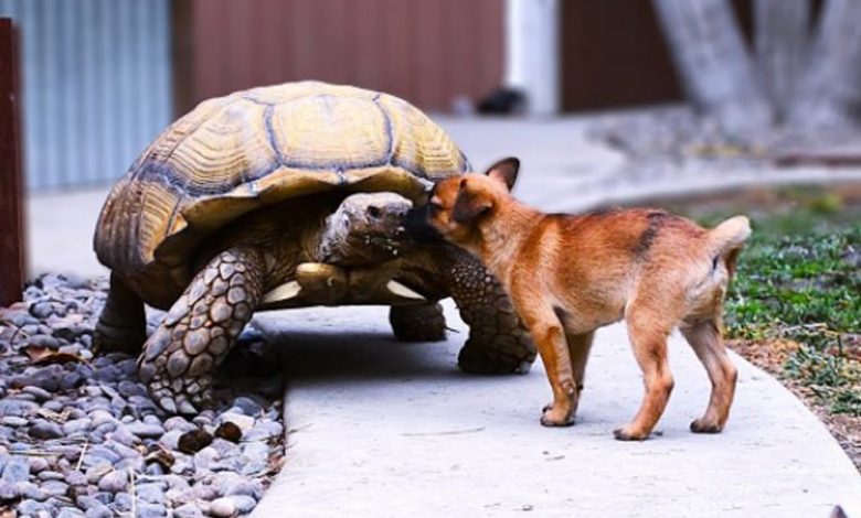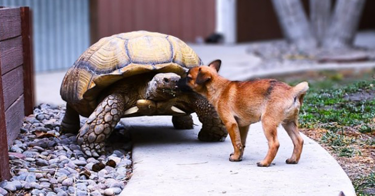 Abandoned Puppies Become Best Friends To A Lonely Giant Tortoise