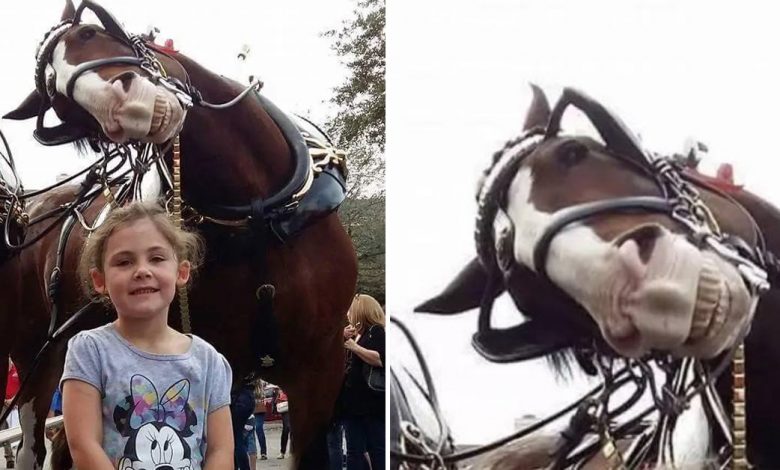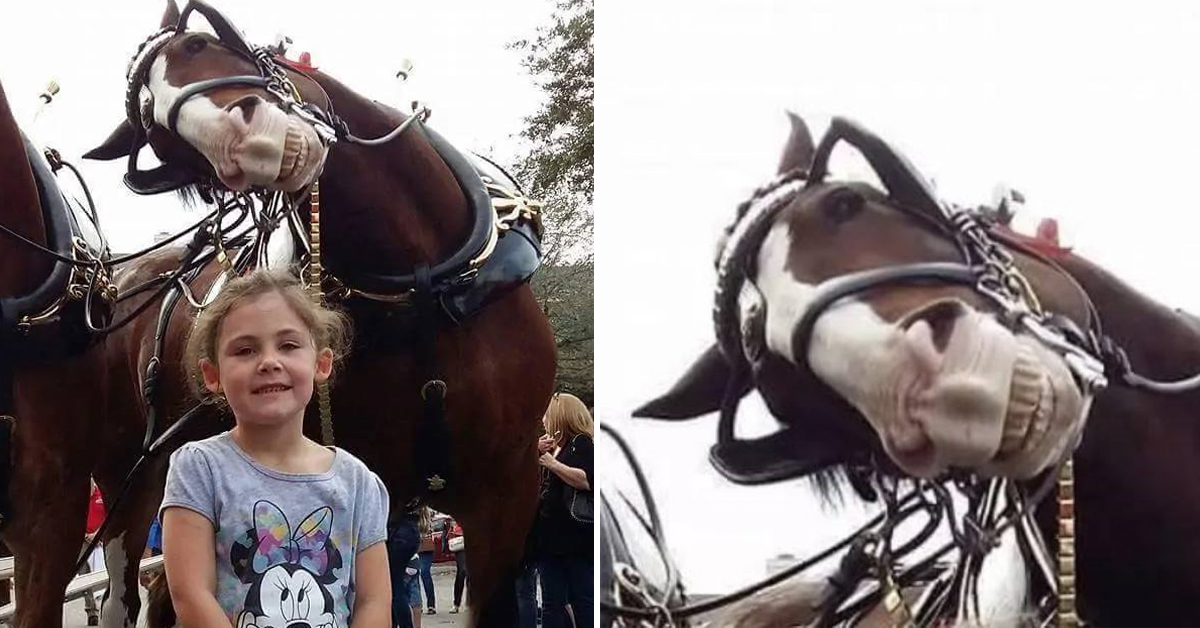 One commenter said “people who say animals don’t have fun well here’s the proof that animals do have fun.” Another replied, “Think it’s a Budweiser Clydesdale who loves to have his picture taken.” And yet another remarked, “How cute is this photo lolI can see why the dad laughed. I’m still laughing. This is a family treasure picture.” Truly this must be an amazing photo! To see the full image, scroll down. Don’t forget to bring your tissues, this one will make you laugh so hard you’ll cry!