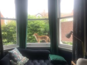 A daring young fox enters her yard on a daily basis and enjoys basking on Rutter’s window ledge.