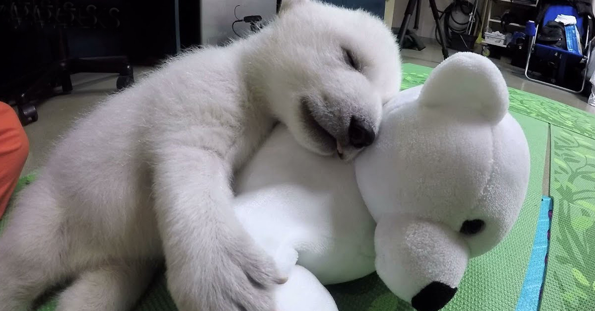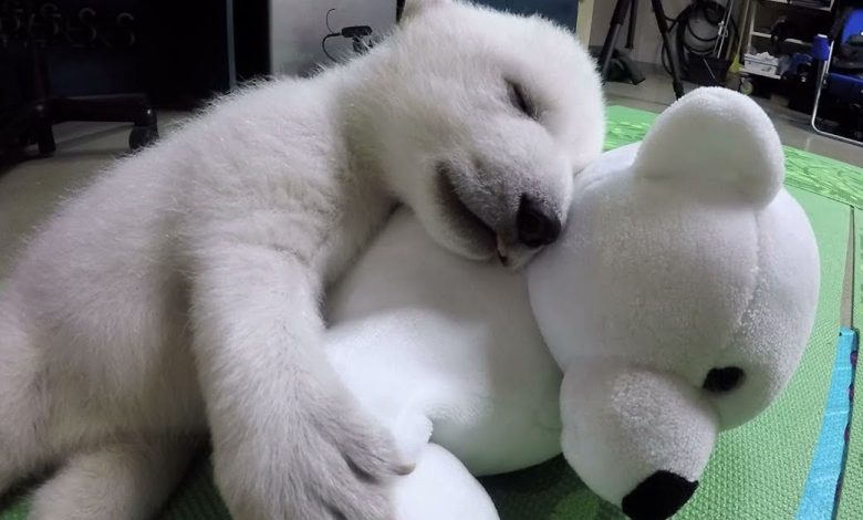 Abandoned Baby Polar Bear Filmed Sleeping With Stuffed Animal Which Makes Cute Sounds