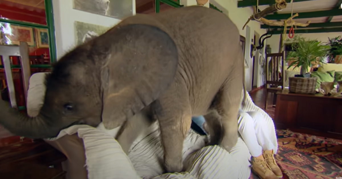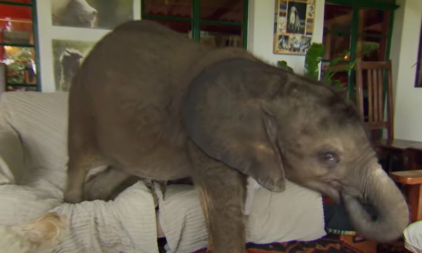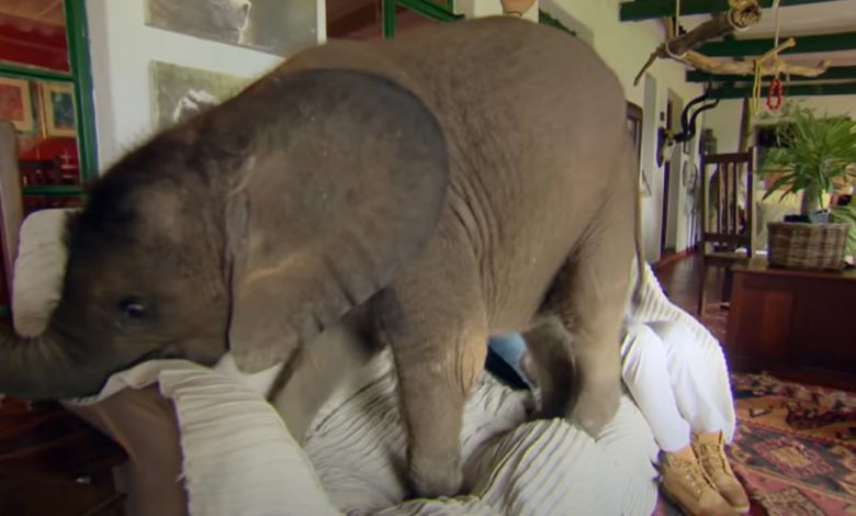 Baby Elephant Keeps Following His Rescuer Wherever She Goes Even To The Couch