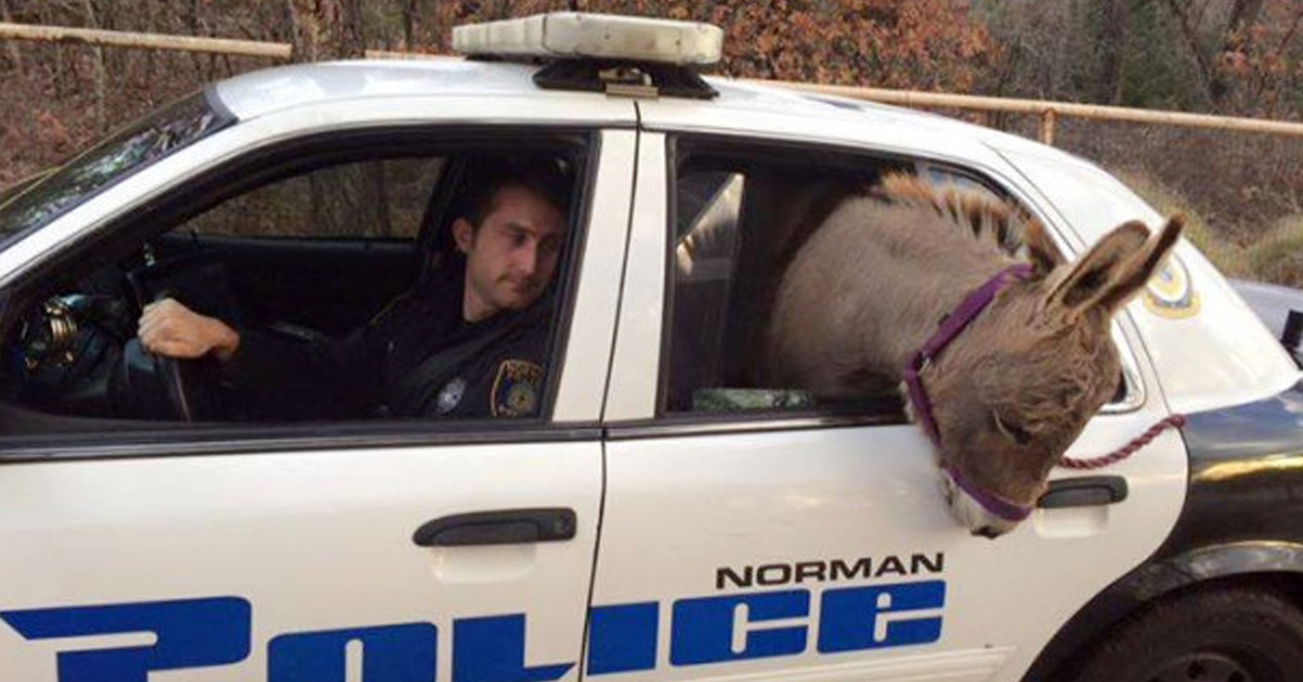 The woman was able to calm the animal down by taking it off the road, and she then contacted the Norman Police Department for help. Kyle Canaan, a police officer, arrived at the scene a few minutes later, and he came up with a great, different idea! It was so hard to wait for a proper vehicle to pick the donkey, who was named Squishy, up, so, the officer put him in the patrol car!