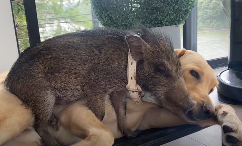 Tiny Baby Wild Boar Believes That Labrador Retriever Is Actually Her Dad