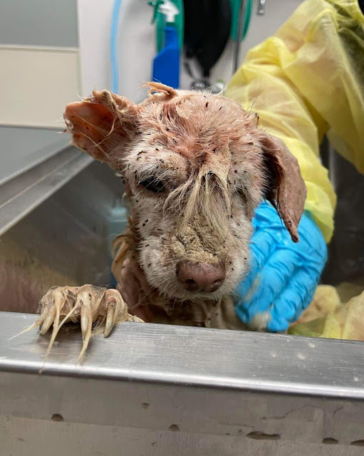 This dog was in bad shape when she arrived, so they gave her water and food before bathing her and removing all the parasites that could be seen walking around and bothering her entire body.