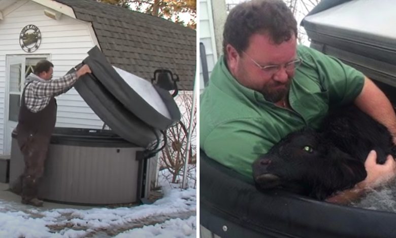 Farmer Finds Calf Cow Freezing In The Snow, Put Her In Hot Water Tub To Warm Her