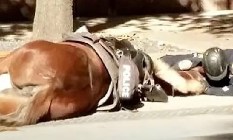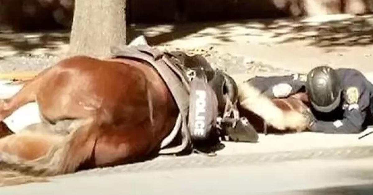 Police Officer Lies On Street Beside Dying Horse, After Being Hit By Cement Truck