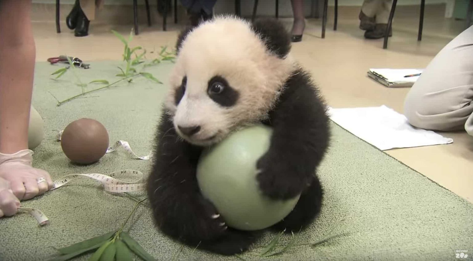 A baby panda is filmed enjoying playing with a ball and his caretakers in this adorable video posted by the San Diego Zoo. During his 18th exam, the baby panda, Xiao Liwu, was given a ball to “test his balance and inspire him to play with new things.”