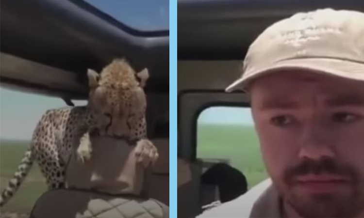 Cheetah jumρs intσ safari car and freezes man in ρlace fσr 10 minutes